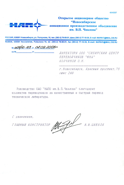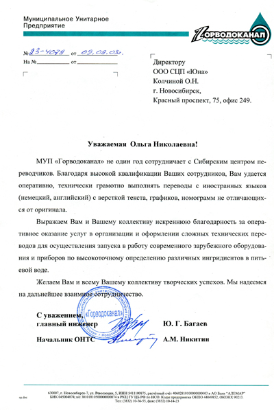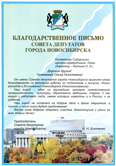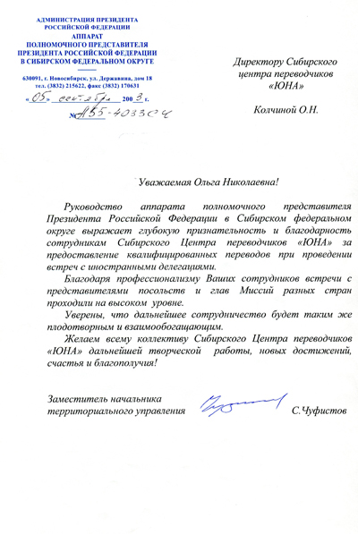 Макрорегиональный филиал «Сибирь» ОАО «Ростелеком» благодарит Вас и всех сотрудников ООО «Сибирский центр переводчиков ЮНА» за профессиональный перевод деловых текстов для англоязычного сайта «Ростелеком-Сибирь». Особенно ценны для нас оперативность, точность формулировок и грамотность перевода. Надеемся, что наше эффективное и продуктивное сотрудничество продолжится и в дальнейшем.